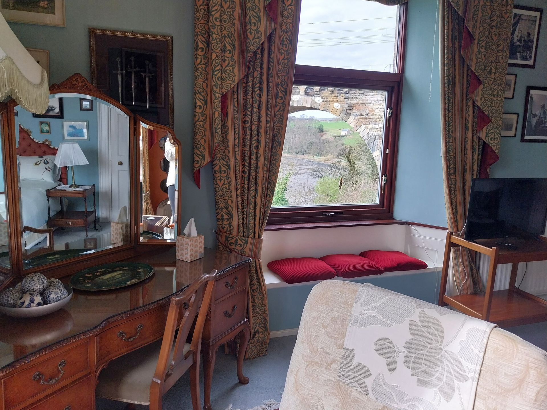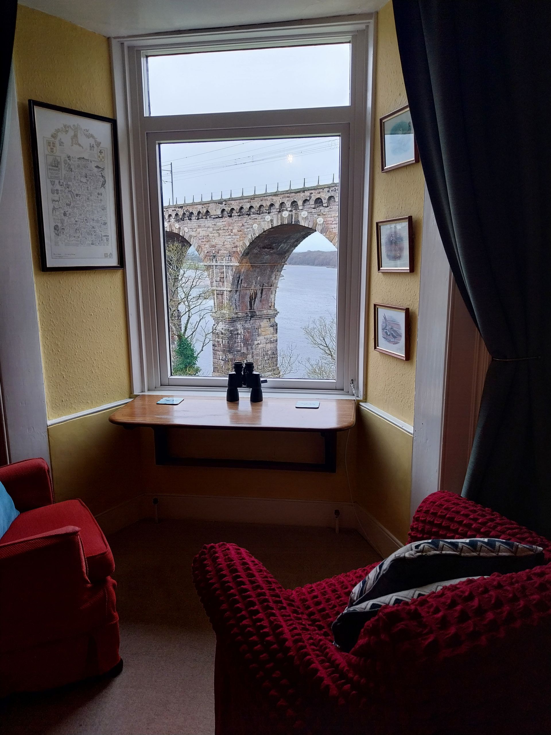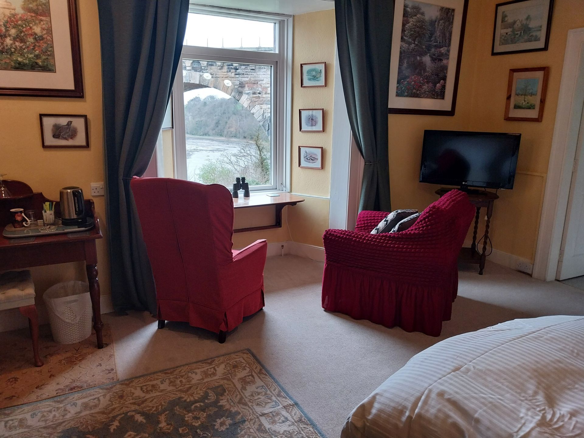 This is a sumptuous first floor room configured as comfy superkingsize-zip-and-link bed or twin beds, and en suite shower. Accentuated by an idyllic view of the gardens and the river it’s perfect for watching trains crossing the Stephenson bridge.