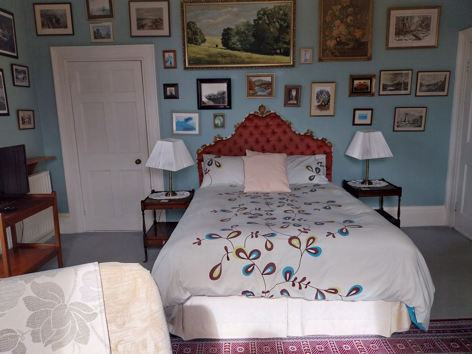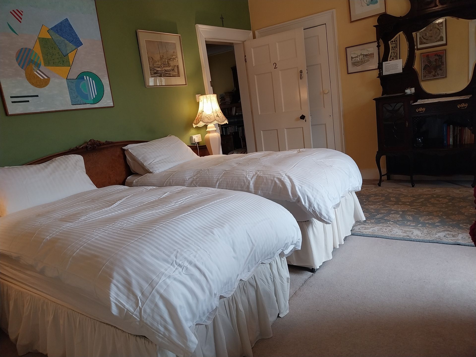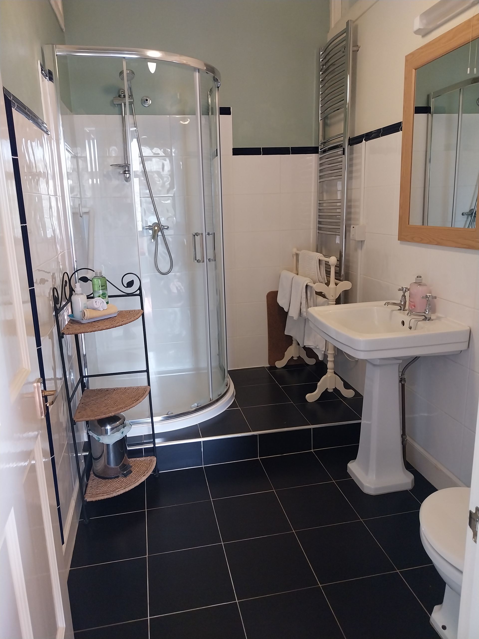 This is a sumptuous first floor room configured as comfy superkingsize-zip-and-link bed or twin beds, and en suite shower. Accentuated by an idyllic view of the gardens and the river it’s perfect for watching trains crossing the Stephenson bridge.